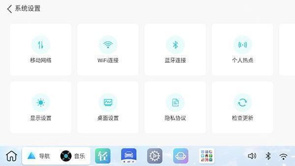 齿轮图标进入系统设置界面,可调整显示、声音等各项参数;