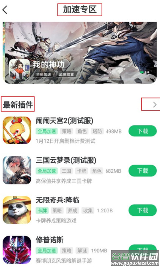 2、在加速专区里面找到最新插件这里,这里面的游戏大部分都是支持加速的;