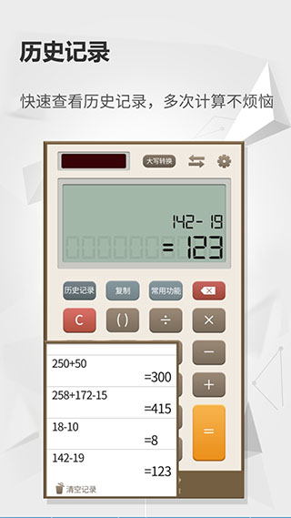 计算器+app是一款设计简约但功能强大的计算工具,界面采用清爽的写实风格,操作区域布局合理,视觉体验舒适自然。这款应用将基础计算与科学功能完美融合,支持从简单算术到复杂公式的全场景运算,特别适合学生、财务人员及商务人士使用。其轻量化设计让运行更加流畅,历史记录功能方便回溯计算过程,所有操作均支持离线完成。最让人省心的是全程无广告干扰,大写转换和内容复制功能也让工作效率大幅提升。喜欢的就来谷普下载体验吧。