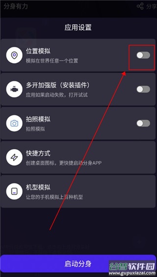 进入软件后选择需要修改定位的应用,点击图标右上角进入应用详情页;找到位置模拟功能并开启开关,最后启动分身即可生效;整个过程无需复杂设置,定位信息会实时同步到分身应用中。