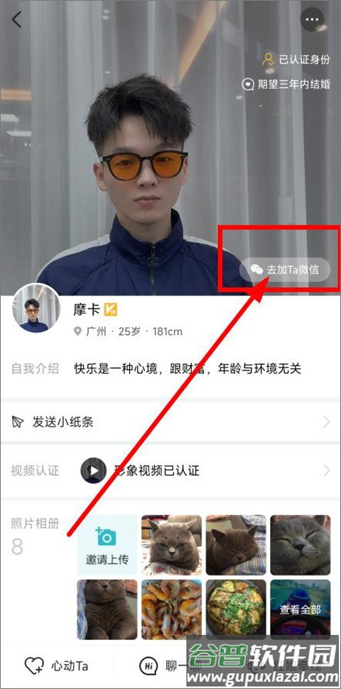 2、在用户详情页查看照片、认证信息等资料,点击发送小纸条按钮即可开始交流。