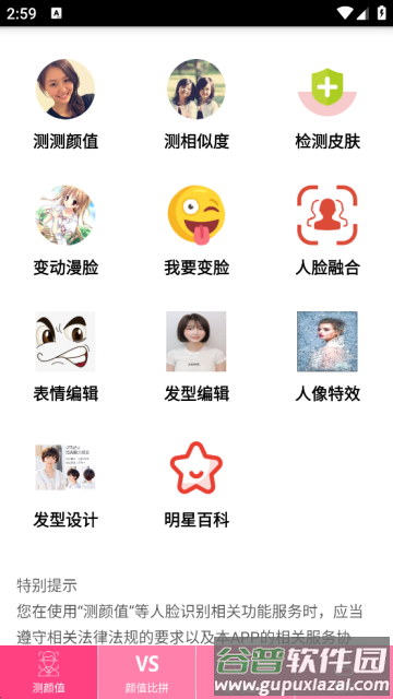 采用专业级人脸识别引擎,可精确捕捉面部72个特征点;支持双人照片比对功能,能计算出两张人脸的匹配度;内置颜值排行榜系统,用户可以参与全网颜值PK;提供个性化发型建议,根据脸型特征推荐合适发型方案。