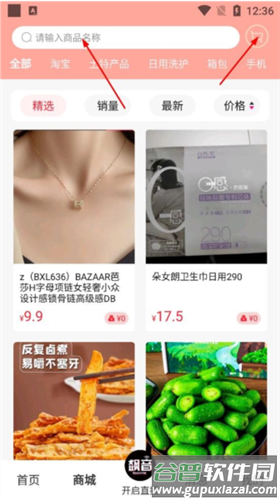 2、在搜索框输入商品关键词,点击右侧购物车图标完成查询;