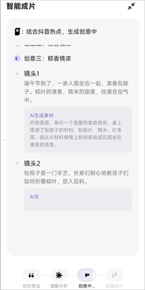 点击“智能成片”,在输入框中填写创作意图,例如“全家一起包粽子过端午”