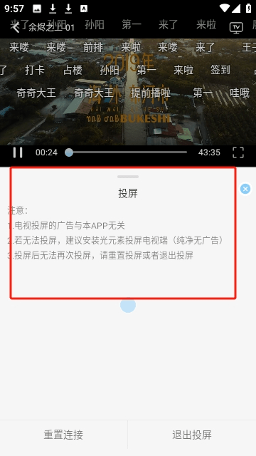 轻点播放画面,会弹出功能菜单,找到电视图标并点击。