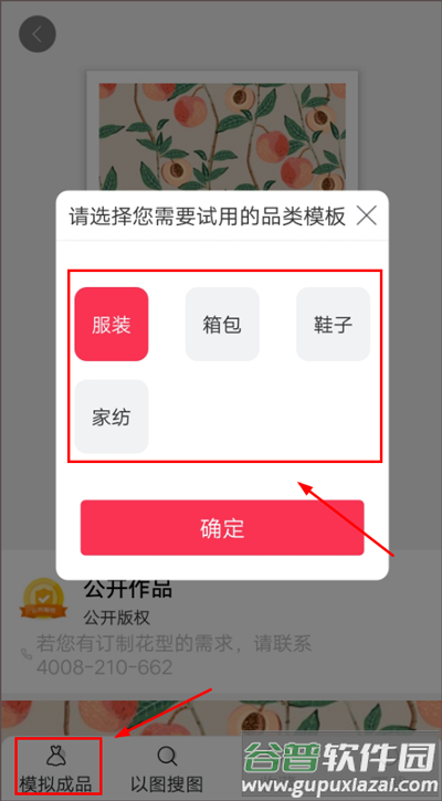 2、选定面料花型后,点击页面中的【模拟成品】功能,选择合适的设计模板;