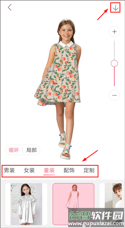 3、在【成品】页面中,提供男装、女装、童装及配饰等多种实用款式模板,用户可根据不同花型选择对应款式进行虚拟样衣预览,确认效果后点击保存图片,即可将样衣图片下载至手机。