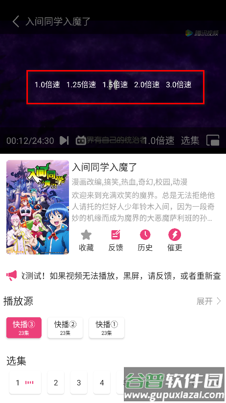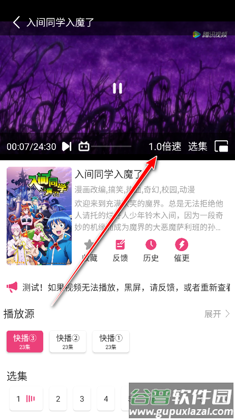 2.在播放界面点击显示“1.0倍速”的按钮;