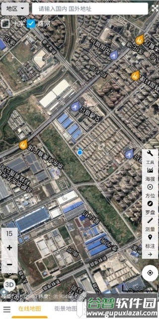 4、使用侧边工具栏的海拔查询、电子罗盘和面积测量功能。