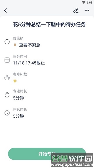 具体操作为点击右上“…”或“铅笔”图标编辑待办任务,保存后在待办清单中开启专注模式。