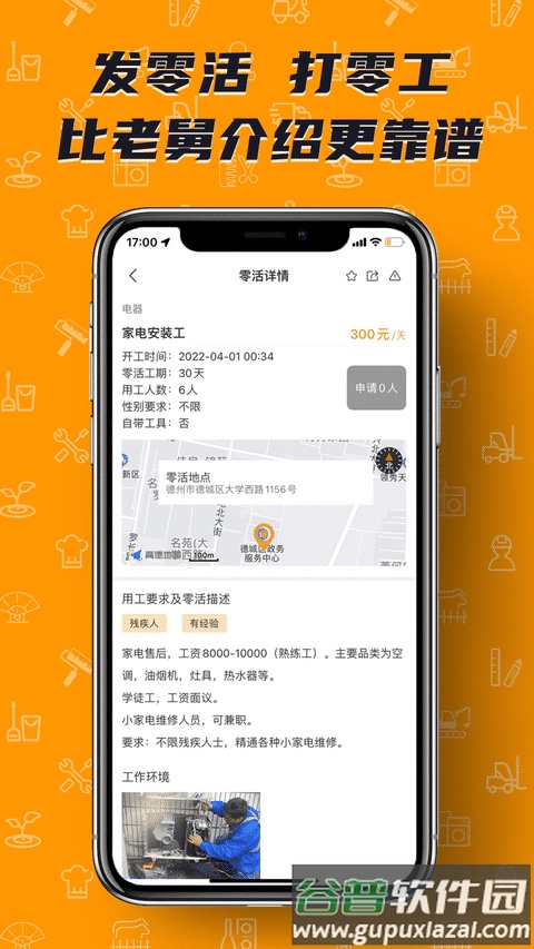 2、展示零工详情包括工作内容与环境描述,辅助用户决策;