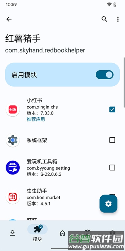 2.重启设备并启动LSPosed,在模块列表中启用红薯猪手,系统会自动勾选小红书作用域;