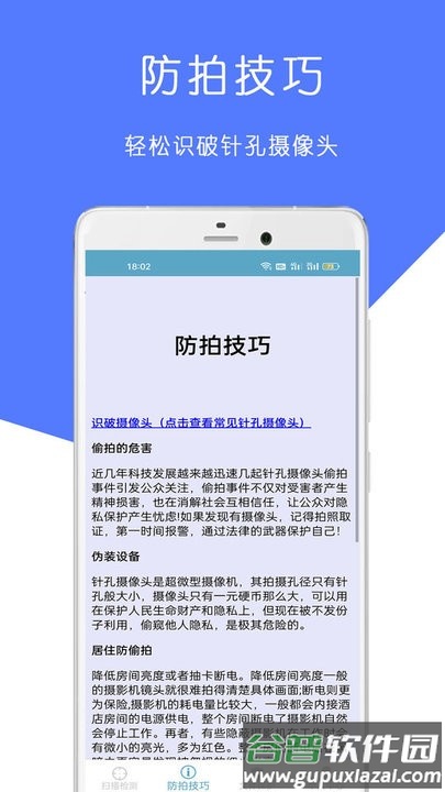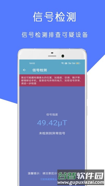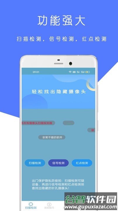 隐形摄像头防拍检测软件是一款便于使用的手机安防工具,能够帮助用户快速识别周围环境中的隐蔽摄像装置。该平台整合了多种探测模式,用户可一键扫描可疑信号源,精准定位潜在偷拍设备。软件内置详尽的防偷拍指南,从磁场感应到网络分析,提供多维度防护方案,适合差旅住宿、租赁居住等隐私敏感场景。