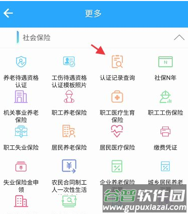 5、在服务列表中找到“社会保险”栏目,进入“认证记录查询”即可查看详细参保信息。
