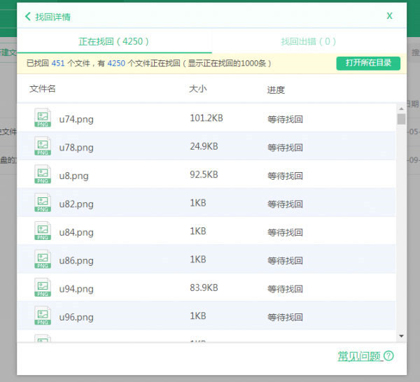 5、在找回详情页面点击【打开所在目录】,即可查看已恢复文件的存储路径。