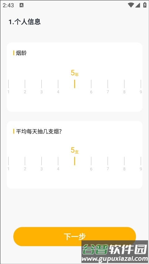1、用户打开今日戒烟记录app,首先需要填写个人信息,包括烟龄、平均每天几支烟等;