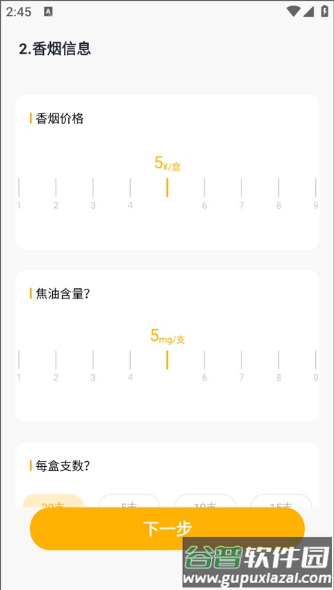 2、第二步用户需要填写常抽的香烟信息,价格、焦油含量、支数等;