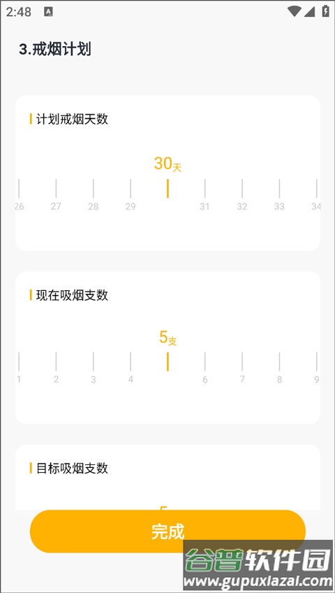 3、第三步用户需要制定自己的戒烟计划,包括戒烟天数、现在吸烟支数以及目标吸烟支数等;