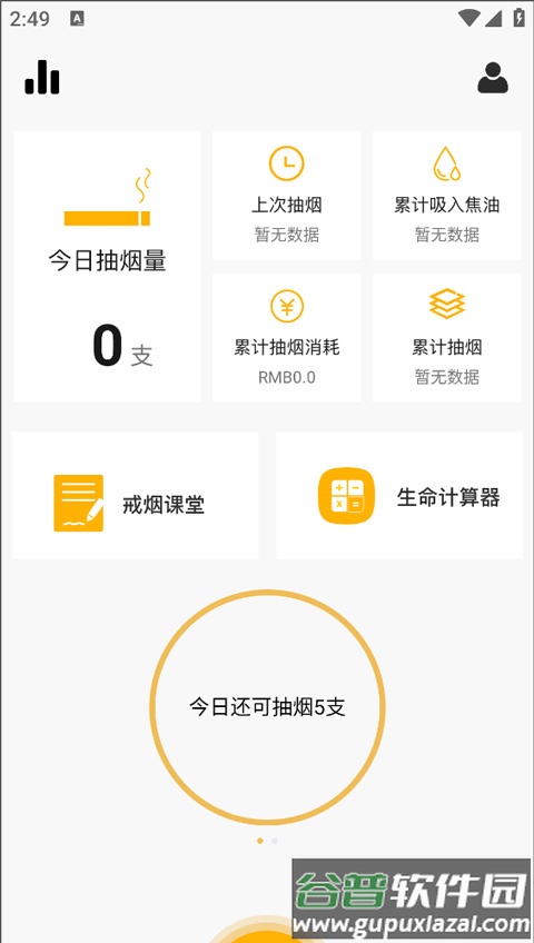 4、用户填写好这些基本信息后进入主页面,在主页面就可以看到今日抽烟量、累计吸入焦油量和消耗多少钱买烟。