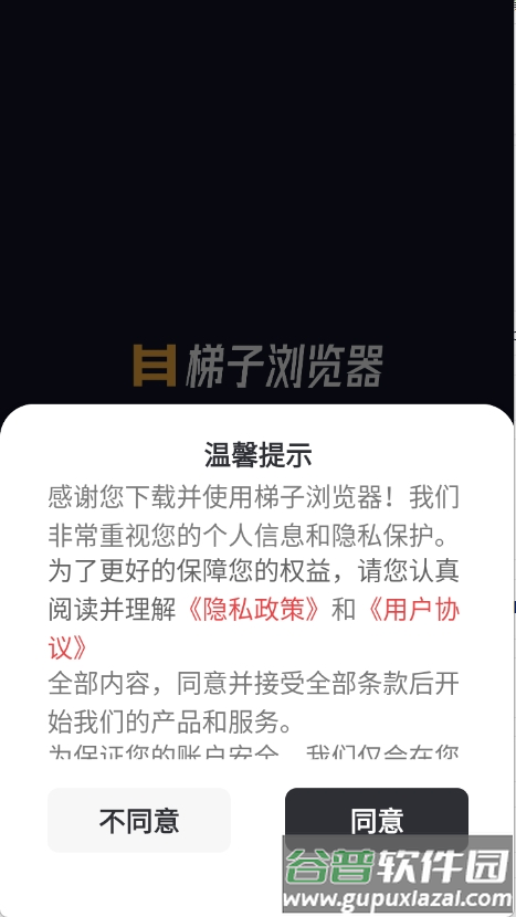 1、用户首先需要下载梯子浏览器应用,打开后仔细阅读隐私政策与用户协议,点击同意后进入主界面。