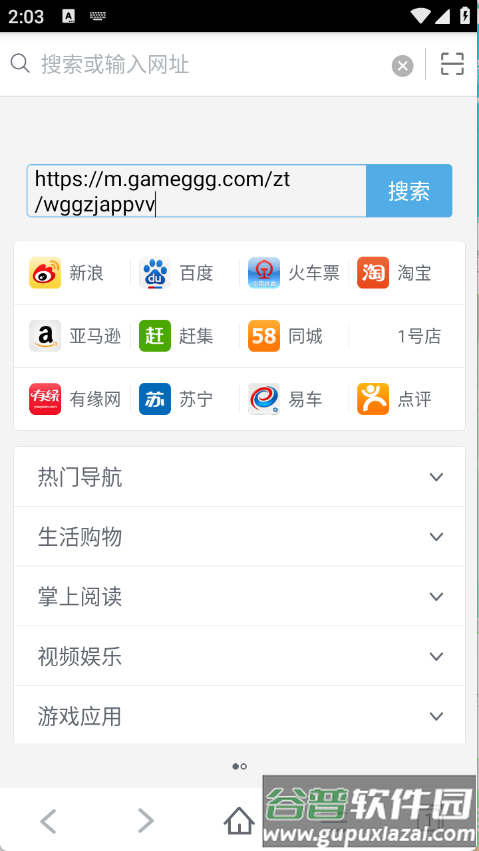 2、打开应用进入首页,在搜索框输入关键词或网址;
