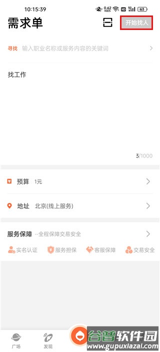 2、填写职业名称、服务内容、预算金额及所在地址,确认后点击开始找人;