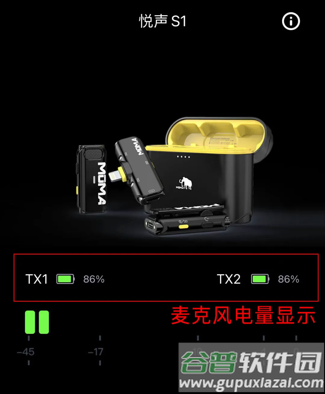 1. 查看麦克风电量。应用主界面以图标与数字百分比结合的方式,分别显示两个麦克风的剩余电量,方便用户在拍摄前快速掌握电力情况,避免录音中途断电。