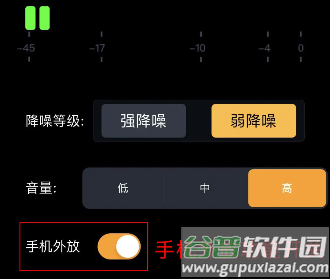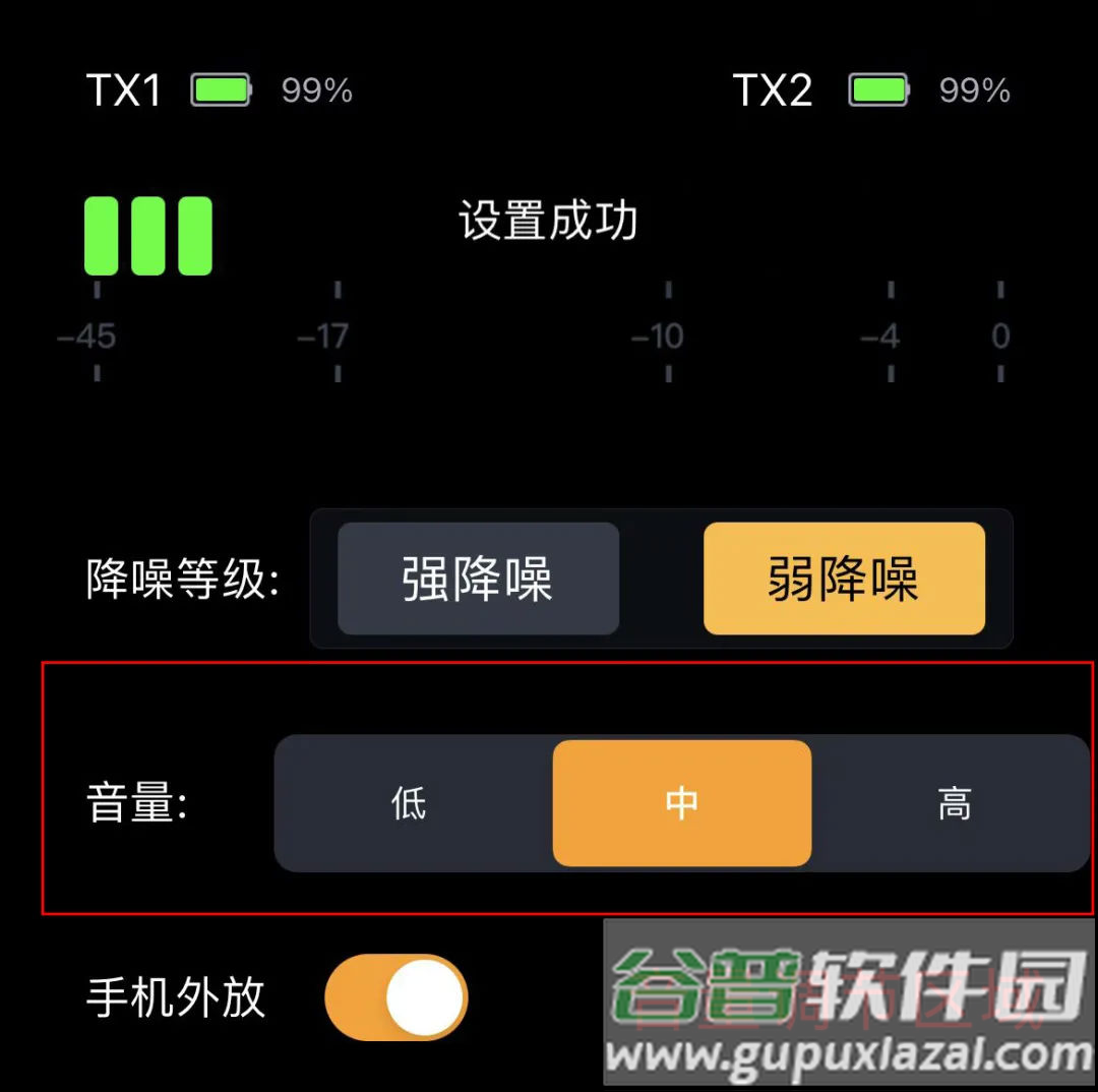 4. 手机外放设置。该功能允许不拔除麦克风直接通过手机扬声器播放录制内容,但在抖音、快手等第三方视频应用中可能干扰正常收音,建议在这些场景下关闭外放选项,以保证录音正常进行。