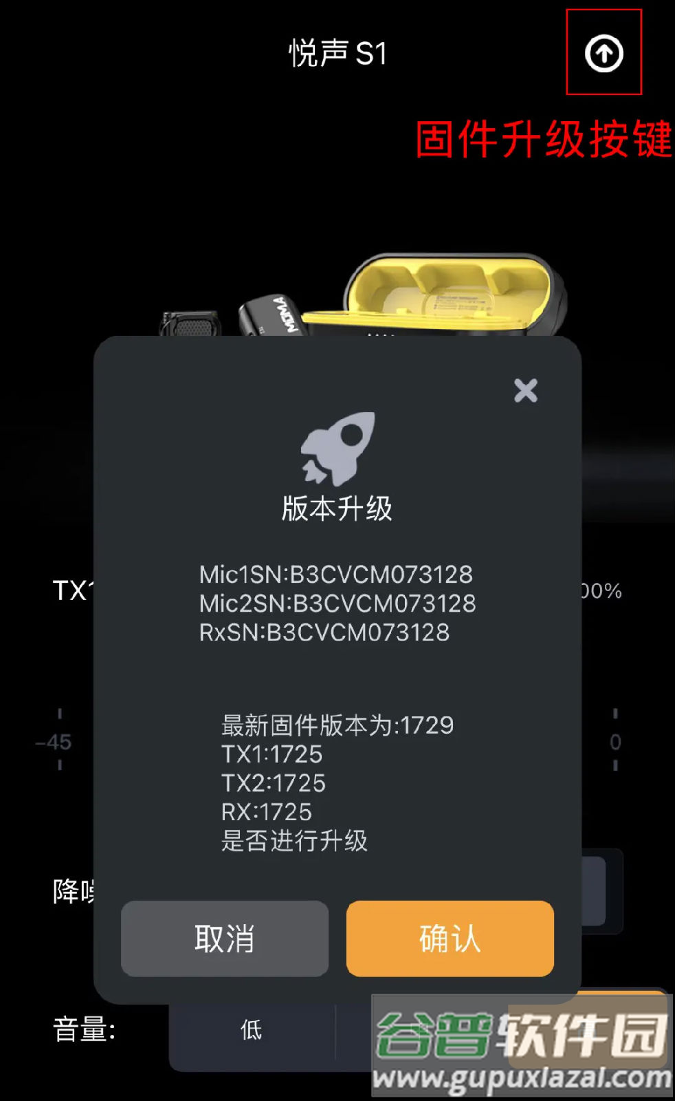 5. 麦克风升级服务。通过应用右上角的设置入口进入升级页面,可检测并安装最新固件,操作分为四步:首先点击升级按钮,接着查看版本信息,然后下载更新包,最后完成安装重启设备。