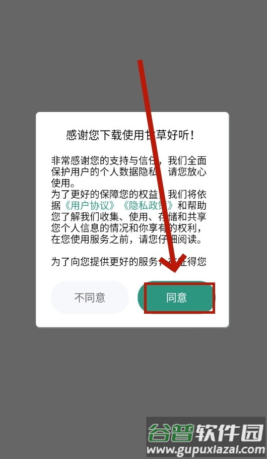 1、下载安装后打开甘草好听App,点击同意用户协议;