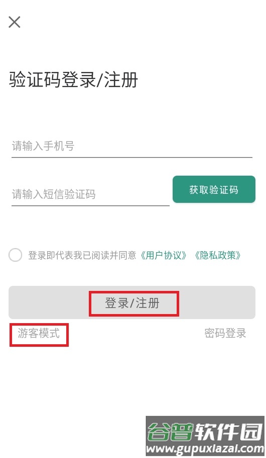 2、进入应用填写账号信息登录或注册,如不想注册可选用游客模式进入;