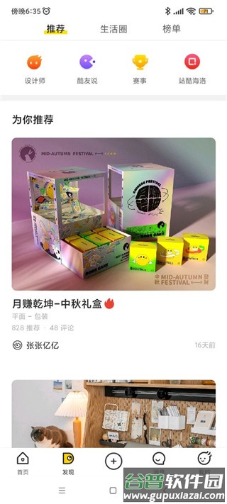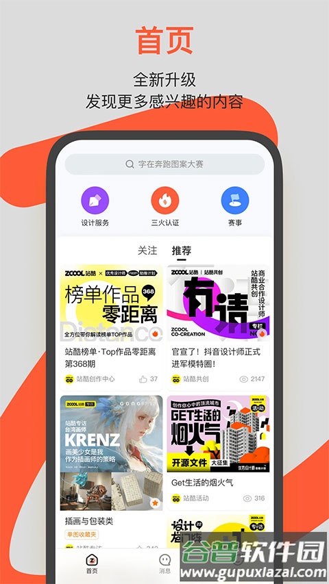 1、首页与关注:同步平台首页的优秀设计内容,实时查看好友发布、推荐及评论动态;