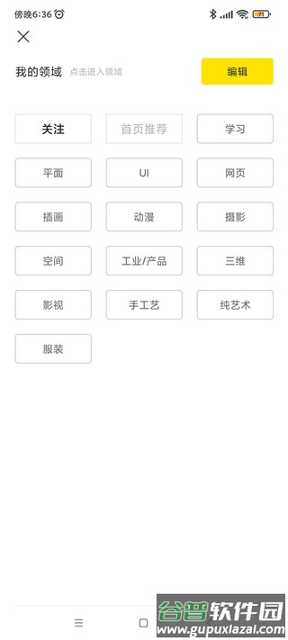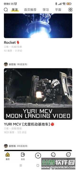 1、下载安装站酷官方版,进入首页可查看关注内容、推荐学习及平面设计板块;