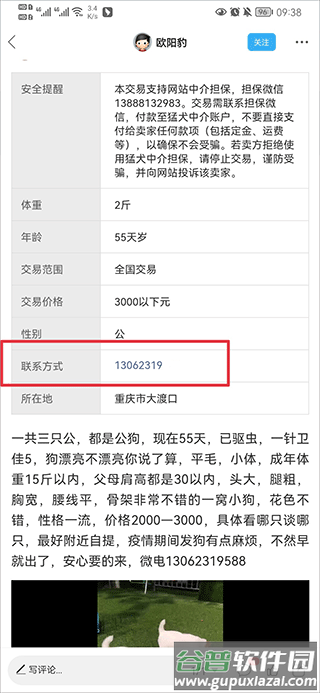 2、点击进入具体犬只介绍页面,查看卖家预留的联系方式,通过电话沟通交易细节;