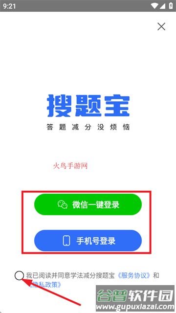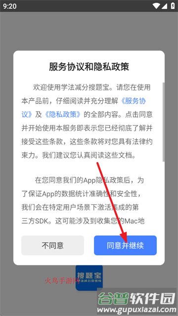 启动学法减分搜题宝应用,仔细阅读服务协议与隐私政策,点击同意后进入下一步;