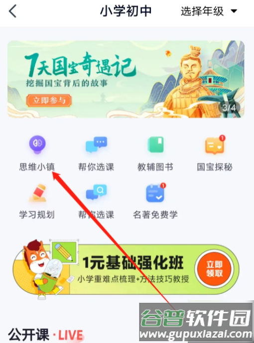 3. 在首页界面中找到思维小镇入口,点击即可查看相关学习内容。
