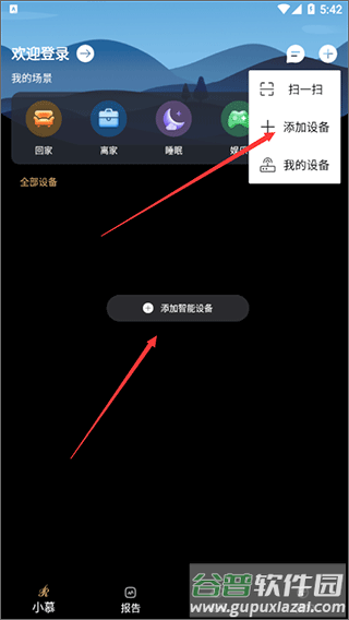 1、进入app首页,点击右上角的“+”图标,或直接选择“添加智能设备”选项;