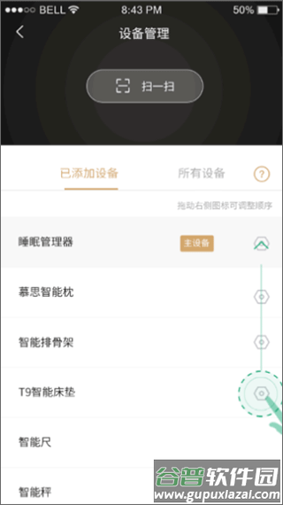 3、开启手机蓝牙搜索附近设备,点击目标设备即可完成添加;添加后长按某睡眠设备右侧区域,可将其拖动置顶设为主设备。