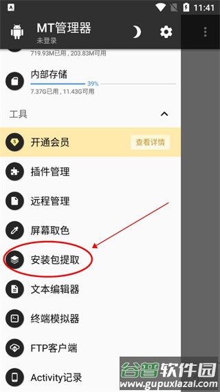 1、启动MT管理器中文版,从左上角菜单选择安装包提取功能;