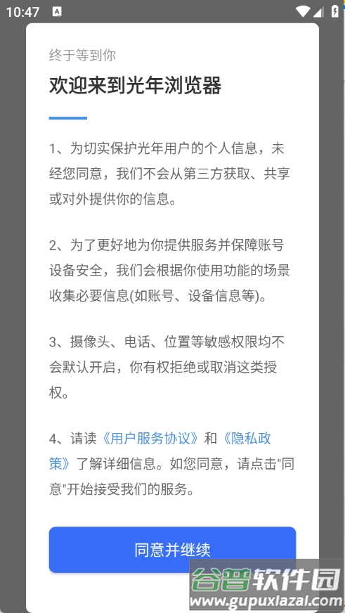 1、先下载光年浏览器应用,安装完成后阅读并同意隐私政策与用户协议;