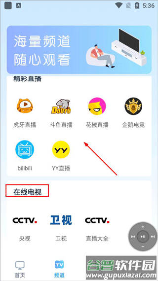 2、进入频道页面,能搜索并播放多个影视平台的直播内容和点播节目;