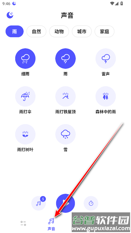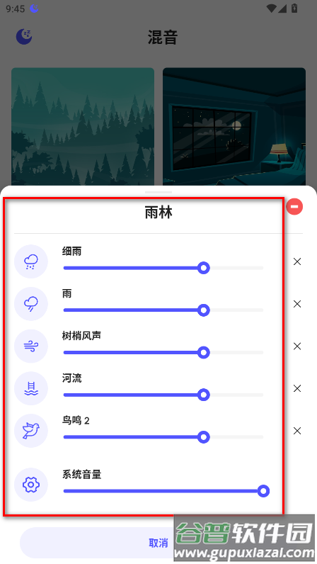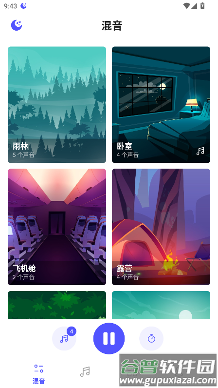 1.启动咕得耐应用程序,主界面呈现雨林、卧室、飞机舱、露营等不同环境的音效板块。以下随机选取一个板块进行演示。