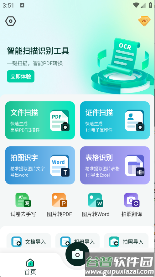 2、首页集中了多种扫描识别功能,包括文件扫描、证件扫描以及拍图识字等。