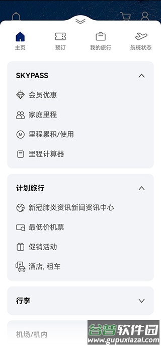 2. 主界面概览:成功登录后进入应用首页,右上角设有通知图标,可查看最新航班公告;