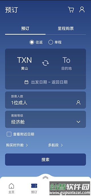 3. 机票预订流程:点击底部预订按钮,输入出发地与目的地、乘机人数及舱位等级,点击搜索后系统将显示可选航班,选择合适班次即可完成购票;