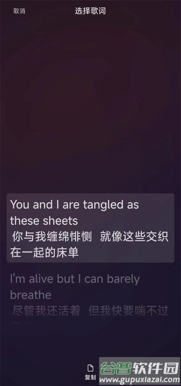 播放音乐时长按歌词或通过更多菜单均可复制歌词内容。
