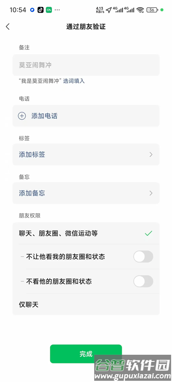 添加好友时可直接设置朋友圈权限,包括不看对方或不让对方看自己的动态。