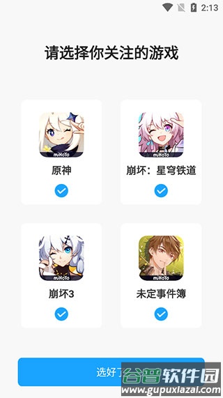 1、首次启动米游社APP时,系统会提示选择感兴趣的游戏板块。注意至少需要选择一个游戏才能继续操作。