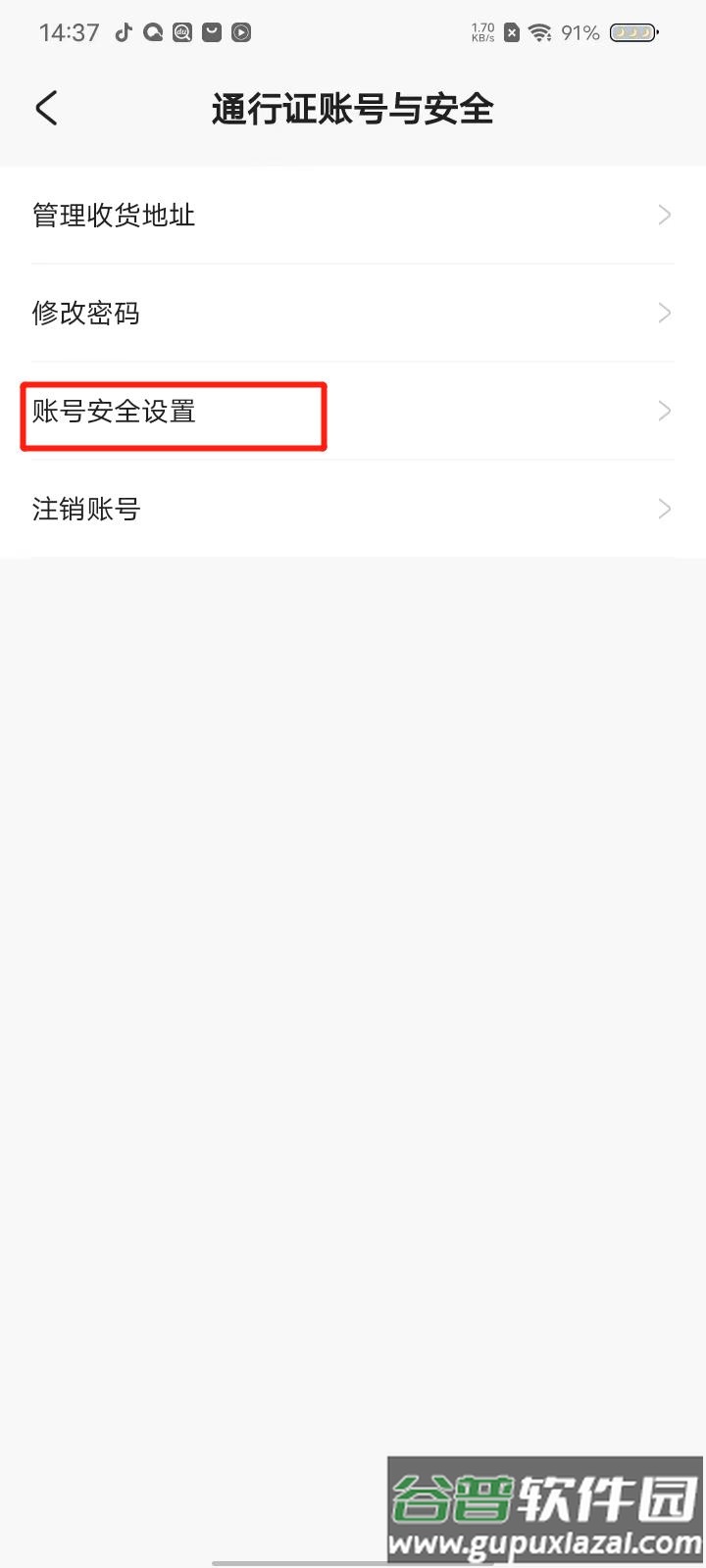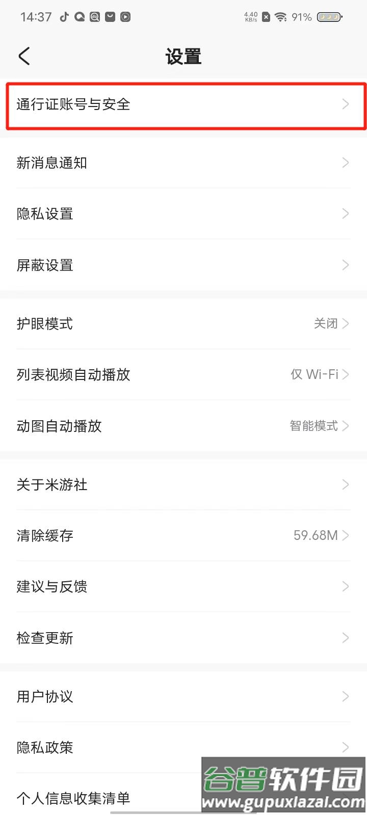 2、在设置菜单中找到通行证账号与安全条目,点击进入账号安全设置页面。
