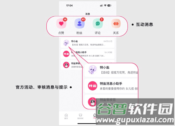 3、消息;集中显示官方通知、OC关系邀请与社交互动信息;记得及时回复好友消息,关注平台活动动态;